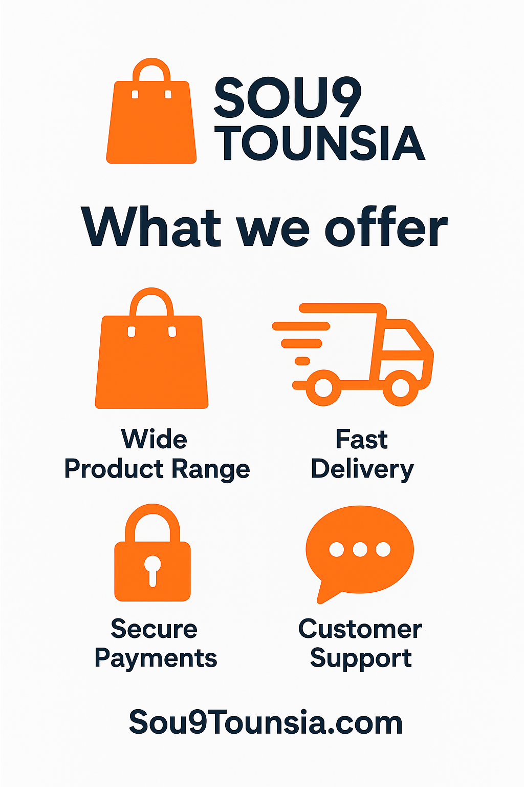 Découvrez des offres exclusives sur une large gamme de produits : mode, technologie, maison, artisanat, beauté, et plus encore. Notre objectif est de soutenir l’économie locale tout en offrant aux Tunisiens un espace d’achat moderne et fiable.